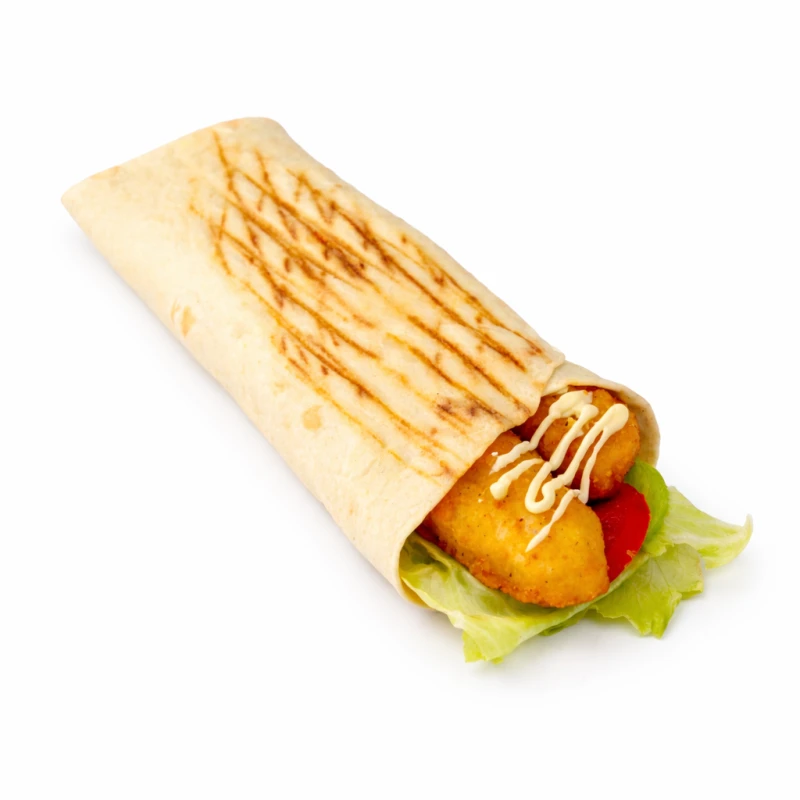 лепешка, стрипсы куриные , салат айсберг, свежие томаты, соус цезарь